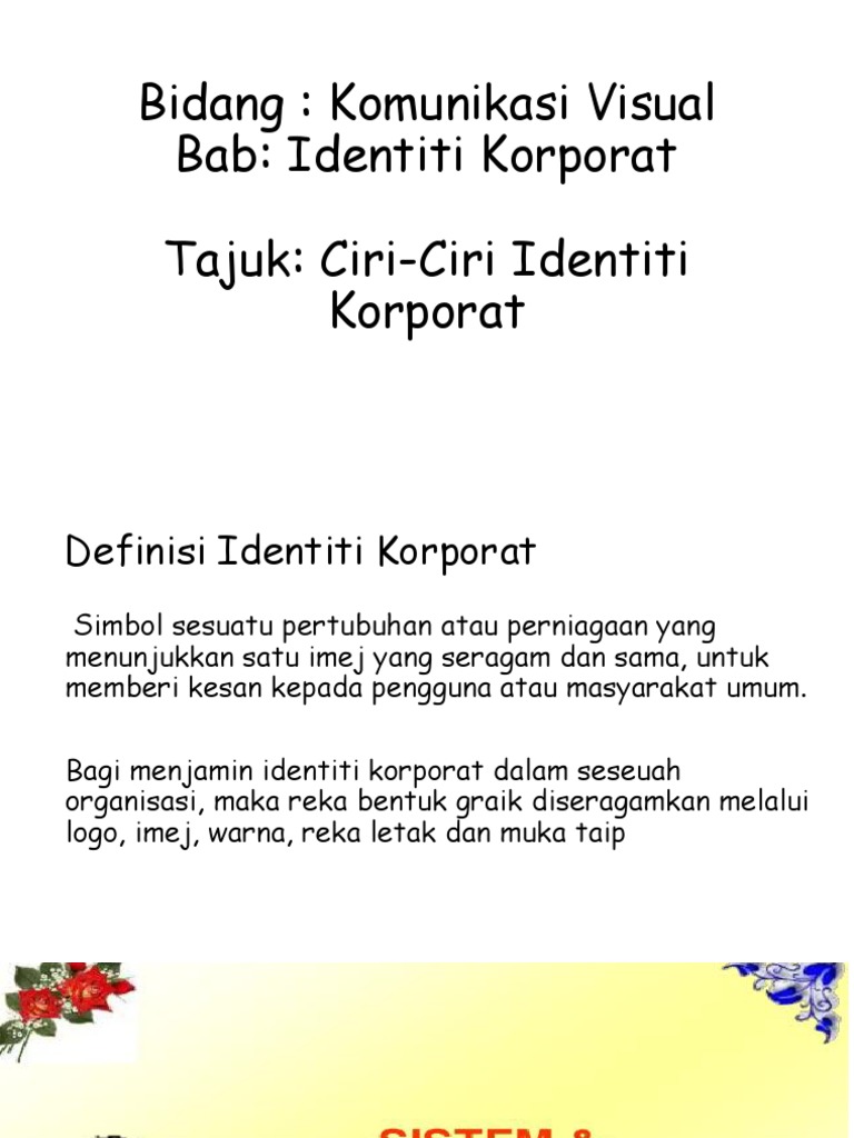 Warnataipserta gaya reka letak bg segala bahan cetak perlu setaraf dan konsistensama dengan yg terdapat pd logo agar wujudnya 1 imej ketara yg dpat dikesan dengan serta merta. Penggunaan Warna Korporat Warna merah adalah warna korporat UKM Warna merah digunakan secara dominan bagi tujuan semua bentuk penerbitan promosi dan majlis rasmi UKM. Identiti korporat bukan sekadar logo dan nama yang digunakan sebagai satu komponen komunikasi dalam menerangkan identiti sesebuah syarikat.